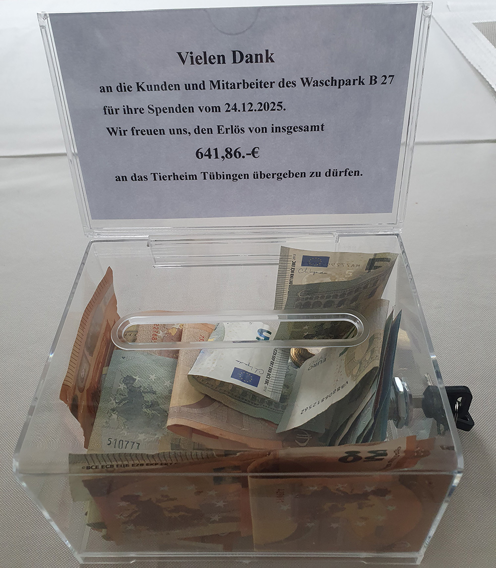Der Waschpark B27 übergab 641,86 € an das Tierheim Tübingen – ermöglicht durch die Unterstützung unserer Kundinnen, Kunden und Mitarbeitenden.